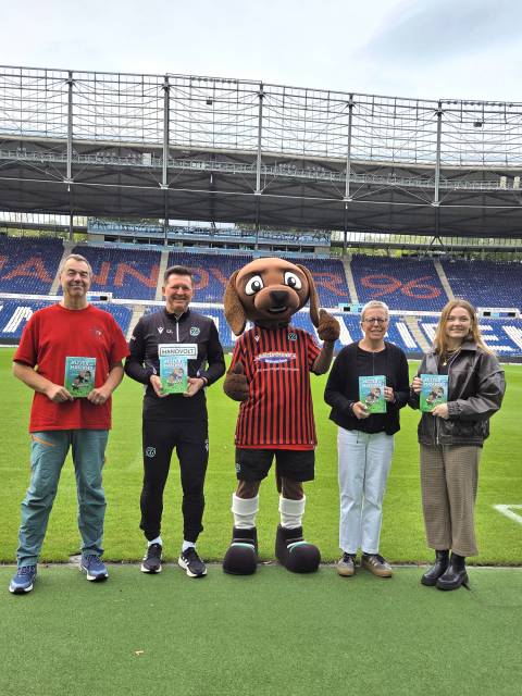 von links: Autor Boris Pfeiffer, 96-Cheftrainer Christian Titz, 96-Maskottchen EDDI, Eva Maria Buchholz, Verlagsleiterin Hinstorff Verlag und Illustratorin Anna Nuxoll